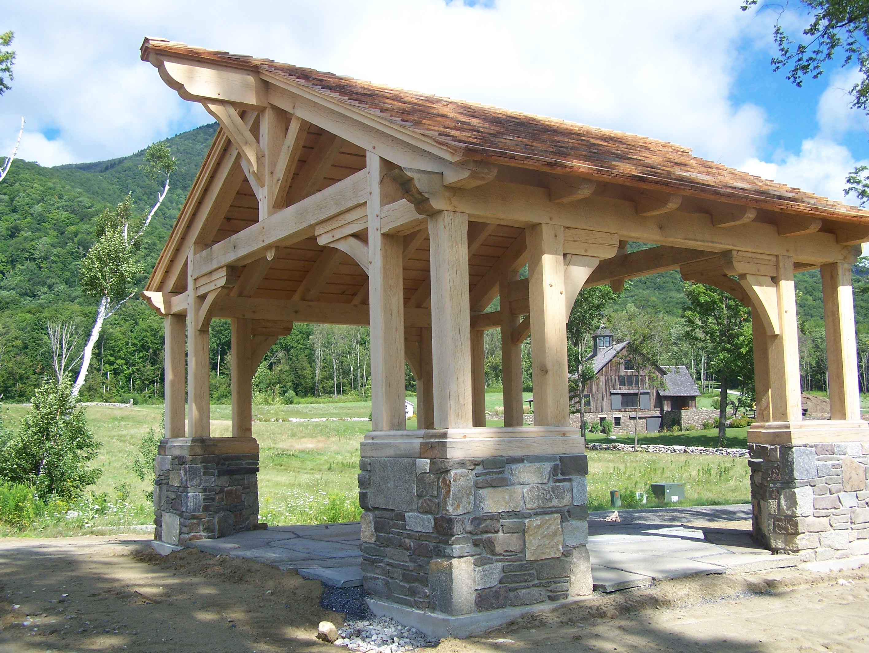 Since we last saw this beautiful frame, the masons finished the stone work. This helps to ground the structure and ties it in aesthetically to the surroundings.