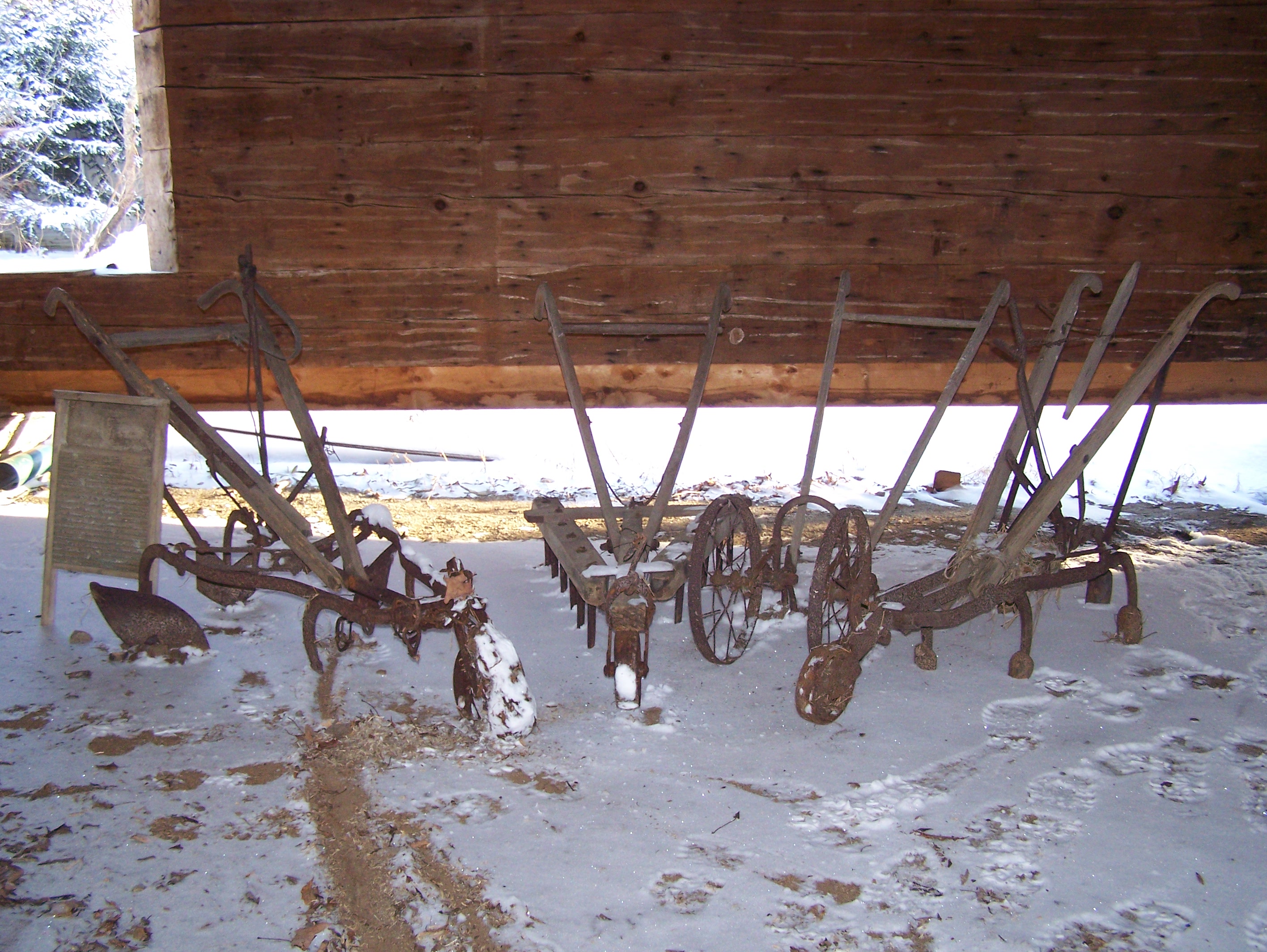 The first bay is falling in. We have braced the timber frame to keep it from further sagging. Horse drawn equipment is stored in this bay, but cannot be removed at this time as it is frozen in the earth. In the mean time, we are being careful to protect it.