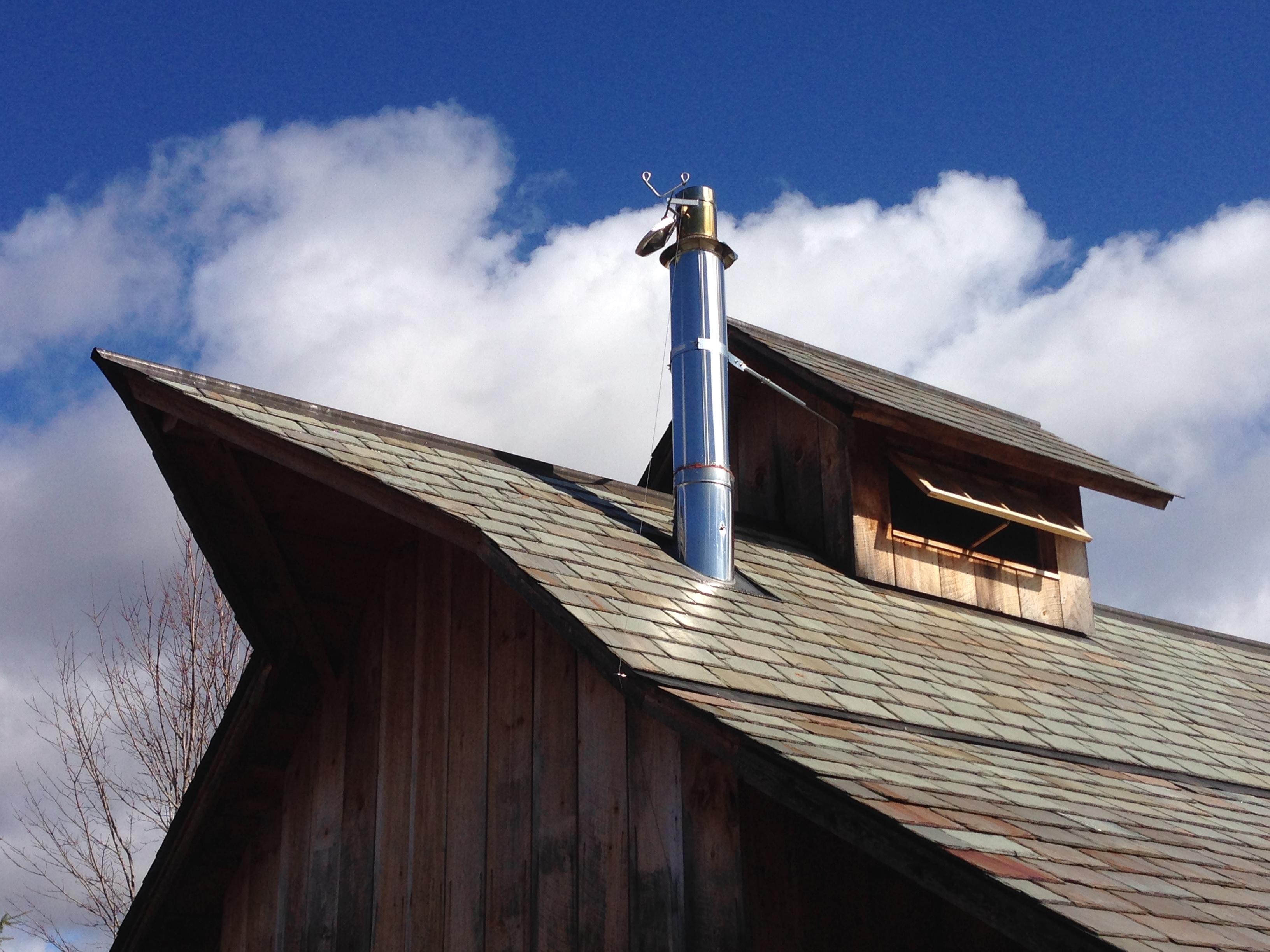 The smoke stack ensures good draft for the wood stove, and the windows on the cupola open to let the steam out.