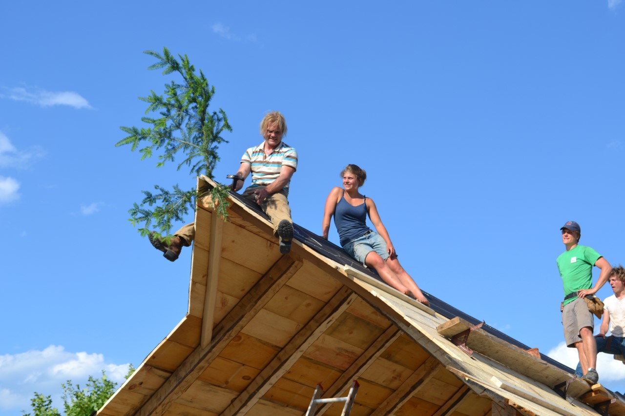 Following millennia of tradition, an evergreen branch is attached to the new frame as a token of respect and gratitude to the trees. Remember the lesson of Gluskabe!