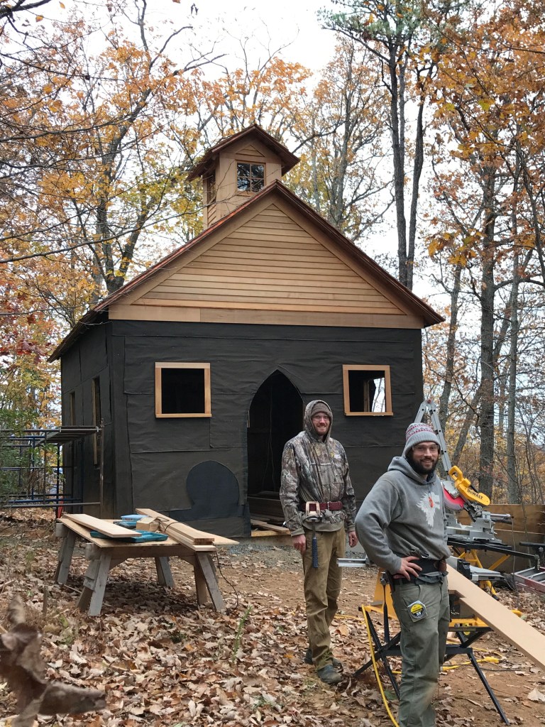 Installing cedar siding on the corn crib chapel in the woods
